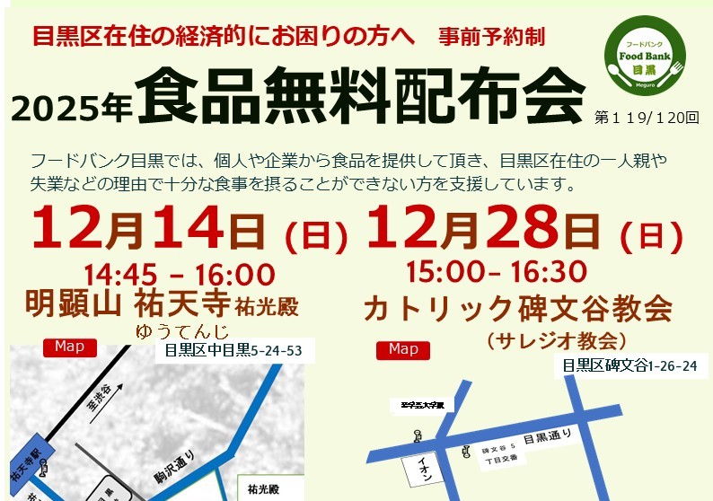 12月14日(日)祐天寺、12月28日(日)サレジオ教会で実施します。